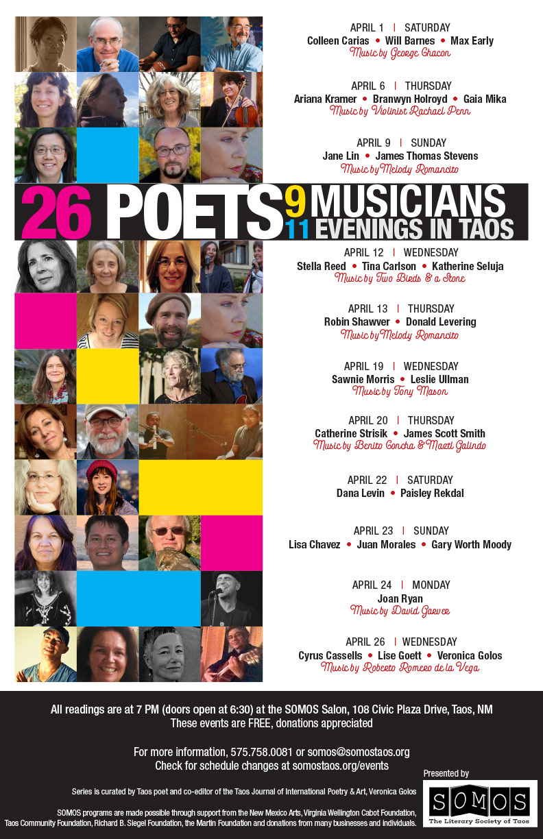 Poet Veronica Golos is curating a terrific reading series at SOMOS in Taos, NM for National Poetry Month. I am honored to be reading on Sunday, April 9 at 7 pm with fellow poet James Thomas Stevens. Melody Romancito, vocalist and guitarist, will also be performing. A little about James:
